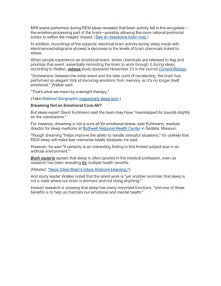 Dreaming may act as a form of overnight therapy by easing painful memories, according to a new study. The study found that the part of the brain that handles emotions becomes less active during REM sleep, and people reported that emotionally provocative images they had viewed had less of an emotional impact after sleeping. This suggests REM sleep helps the brain process difficult experiences. However, sleep is not a cure-all for emotional stress, and dreaming alone will not make all bad memories disappear.