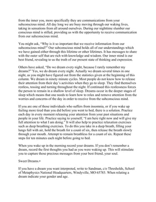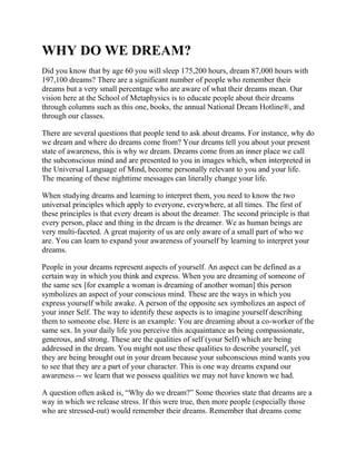 We dream every night as a way for our subconscious mind to communicate with our conscious mind. Dreams come in 90-minute cycles during deep sleep and represent aspects of our self that we may not be aware of. Learning to interpret our dreams can help us expand our self-awareness and gain wisdom from our subconscious. Practicing relaxation techniques before bed can help us remember our dreams by allowing us to achieve deeper stages of sleep.