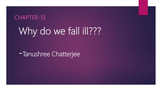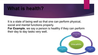 This document discusses various topics related to health, disease, and infectious agents. It defines health and explains that health depends on both personal and social factors like environment, food, economic conditions, and social environment. It defines disease and differentiates between being disease-free and healthy. It discusses the types of diseases like acute vs chronic diseases and how chronic diseases can affect health. It explains the causes of diseases like internal vs external factors and immediate vs contributory causes. It also discusses the differences between infectious vs non-infectious diseases and how diseases can spread through different means like air, food, water, lifestyle, vectors, and sexual contact. Finally, it discusses where disease-causing germs can live in the body and