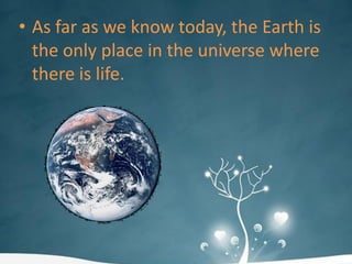 The Earth is unique in that it has an average temperature of 15o C, an atmosphere containing oxygen, and contains water, making it the only known place in the universe that can support life.