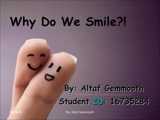 The document discusses four reasons why people smile: 1) It's funny, when finding humor in something. Smiles often occur when watching comedy movies. 2) It's out of the ordinary, produced when something is so shocking that a smile responds. 3) It's welcoming, as smiles can signal friendliness. 4) It's exciting, like when learning of unexpected good news, which can elicit a smile. The document is authored by Altaf Gemmooth and explores different triggers that cause people to smile.