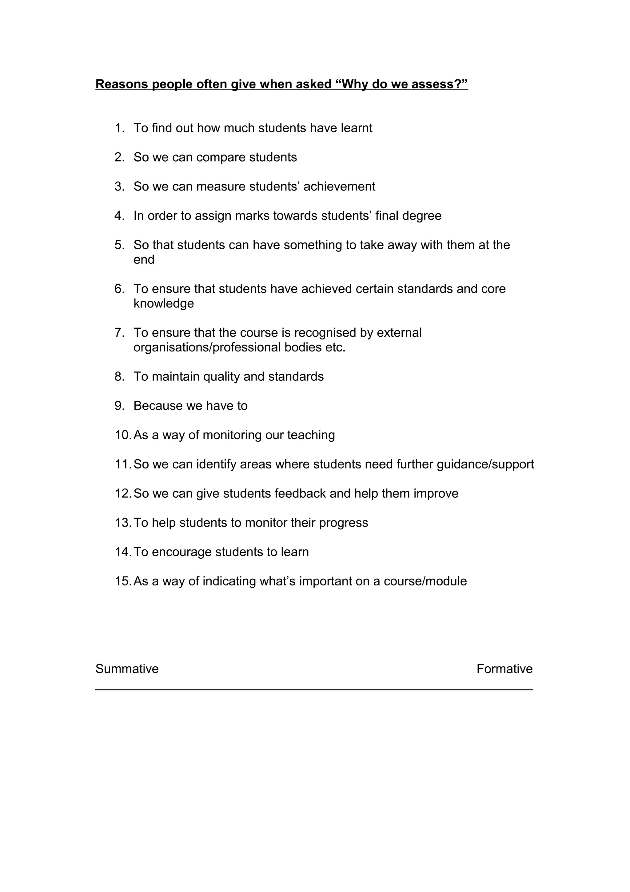 This document lists common reasons that are often given for why assessments of students are conducted. Key reasons include to measure how much students have learned, compare student achievement against standards, provide feedback to help students improve, and ensure courses meet quality standards for external recognition. Assessments also help identify learning needs, monitor teaching quality, and motivate students to learn course material.