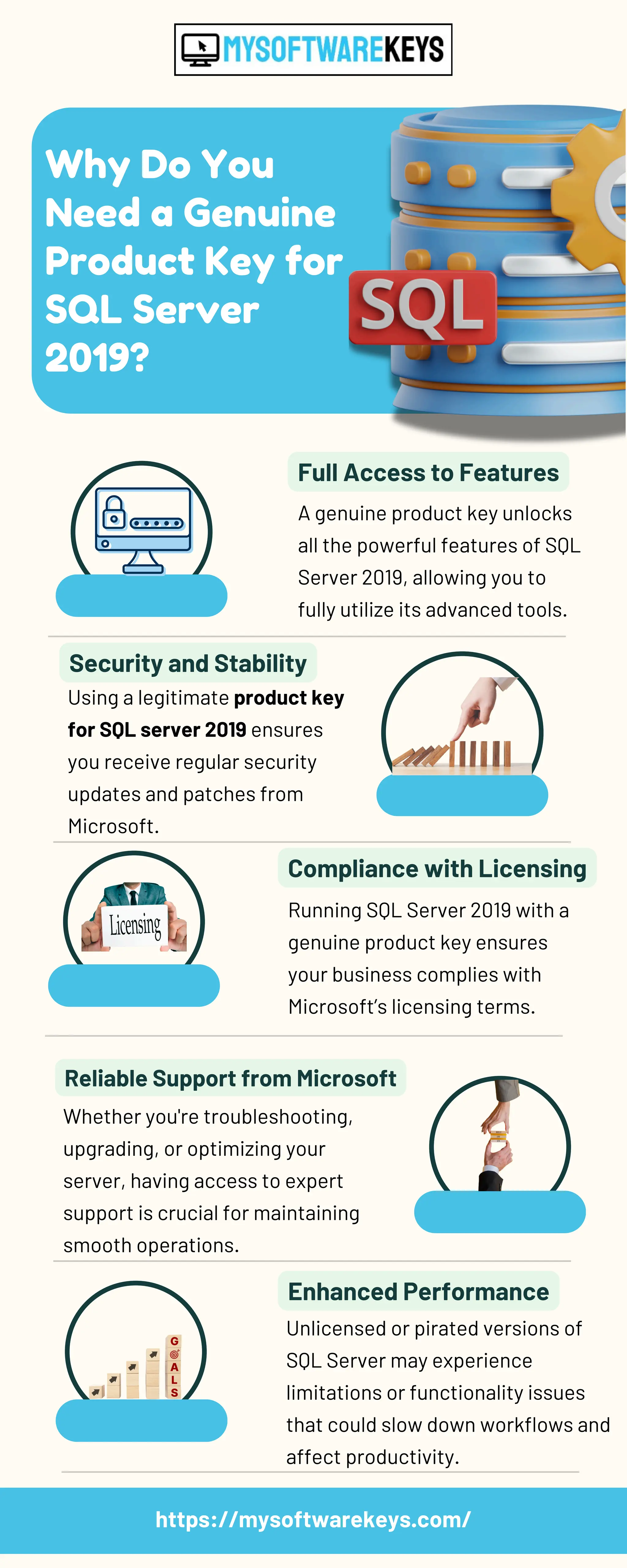 Full Access to Features A genuine product key unlocks all the powerful features of SQL Server 2019, allowing you to fully utilize its advanced tools. Security and Stability Using a legitimate product key for SQL server 2019 ensures you receive regular security updates and patches from Microsoft. Compliance with Licensing Running SQL Server 2019 with a genuine product key ensures your business complies with Microsoft’s licensing terms. Reliable Support from Microsoft Whether you're troubleshooting, upgrading, or optimizing your server, having access to expert support is crucial for maintaining smooth operations. Enhanced Performance Unlicensed or pirated versions of SQL Server may experience limitations or functionality issues that could slow down workflows and affect productivity. https://mysoftwarekeys.com/product-category/sql-server