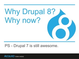The document discusses the importance of upgrading to Drupal 8, highlighting its key features such as HTML5 support, native web services, and improved authoring experience. It emphasizes that while Drupal 7 remains a viable technology, Drupal 8 offers significant benefits for early adopters and is essential for future-ready web development. The author provides guidance on readiness for migration and resources to support the transition.