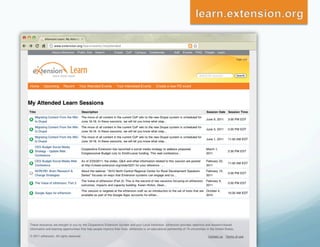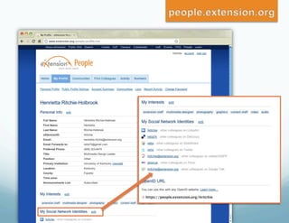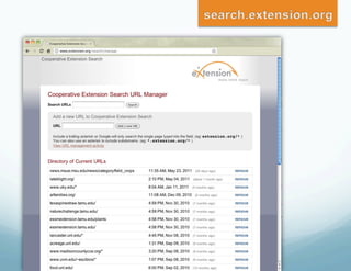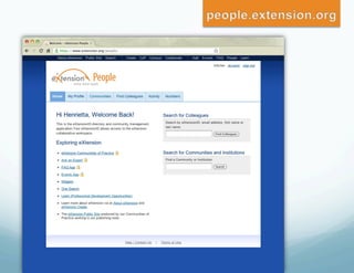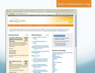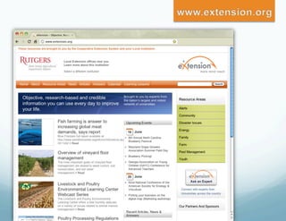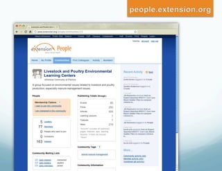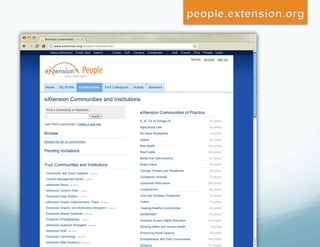 The document discusses eXtension, a new online platform that allows Cooperative Extension services to collaborate, share content, and interact with users. It has transformed how Extension educators work by enabling national communities of practice where over 3,800 educators contribute. Since 2008, eXtension membership has grown from 3,000 to over 14,600 as it provides a valuable resource for supplementing educators' work and researching beyond individual land-grant universities, especially as budgets tighten.