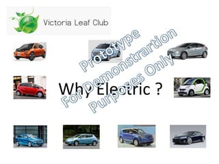 The document discusses the advantages of electric vehicles over gas-powered vehicles. It notes that electric vehicles have no emissions, low operating costs that are typically 15% of the cost of gas vehicles, require no oil changes, have 98% fewer moving parts, virtually no brake pad replacements, and are expected to have twice the useful life of internal combustion engine vehicles. It also provides data showing the increasing sales and models of electric vehicles.