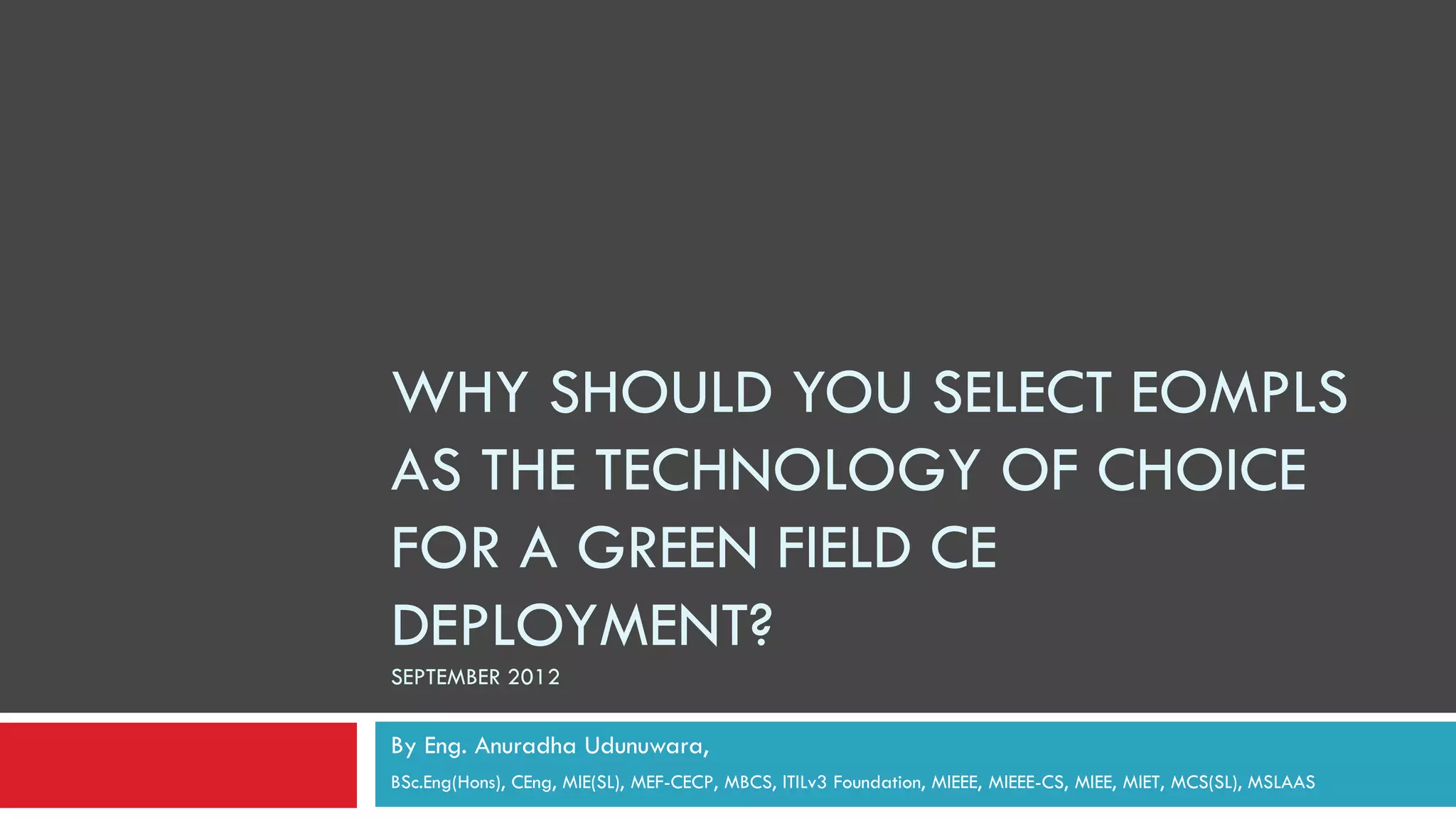 This document recommends EoMPLS as the technology of choice for a green field CE deployment based on the following points: