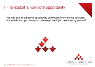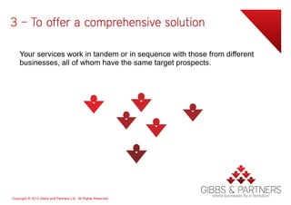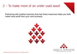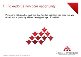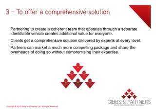 The document discusses 3 reasons to partner with other businesses rather than merging or acquiring: 1) Partnering allows each business to focus on what they do best while reducing risk and increasing flexibility. 2) Partnering delivers a quicker return on investment for all parties. 3) Partnering can be used to "try before you buy" another business. Gibbs & Partners helps identify compatible businesses and facilitates partnerships to create "Ace Pilots working in harmony."