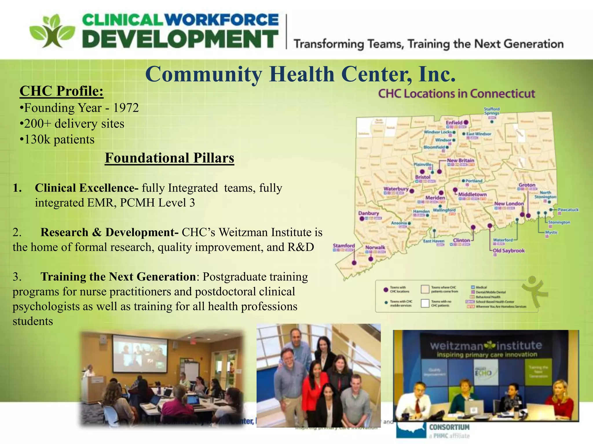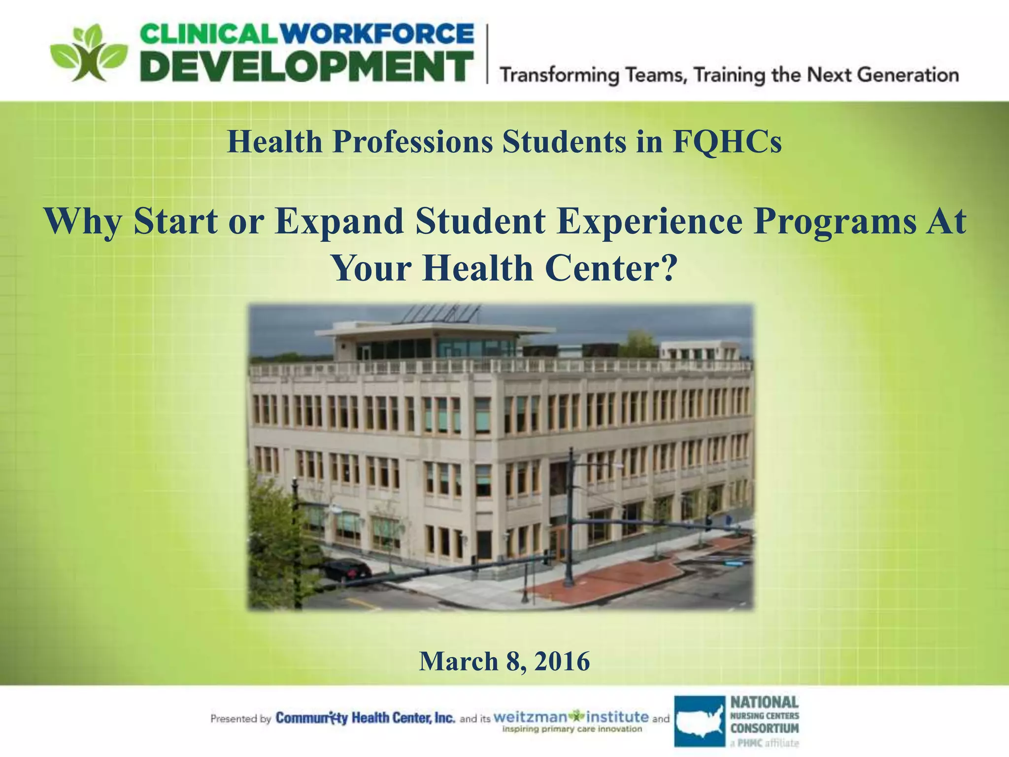 The document presents the importance of starting or expanding student experience programs at health centers, particularly Federally Qualified Health Centers (FQHCs), highlighting the benefits for workforce infrastructure and student education. It emphasizes the role of Community Health Center, Inc. in providing education, training, and technical assistance to enhance team-based care and support the training of future health professionals. Additionally, it outlines the collaborative efforts needed to optimize the student learning experience and recruit skilled graduates into nurse-led health centers.