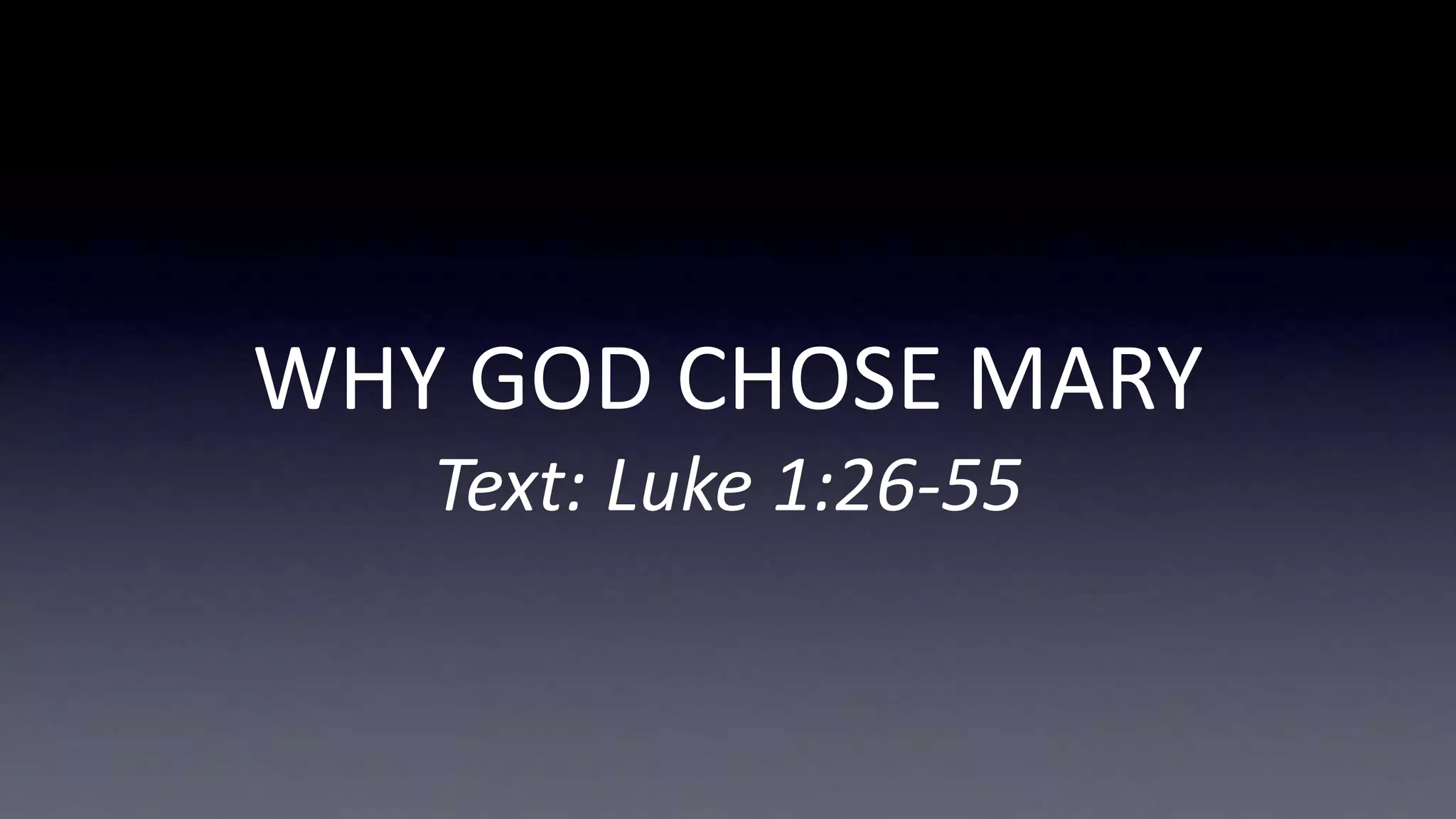 The document discusses why God chose Mary, highlighting her character traits such as her desire to do God's will, her humility, and her willingness to face the costs of obedience. Biblical references emphasize that God looks for individuals with perfect hearts and the courage to trust His promises. Ultimately, it illustrates Mary's faith and her acceptance of God's plan despite potential fears and sacrifices.