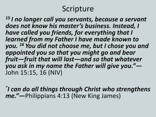 3) God knows each person's needs and gifts, and wants them to use their talents to serve Him and be strengthened by Christ for any task.