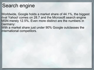 1) Google dominates the search engine market worldwide with a 44.1% market share, much higher than its closest competitor Yahoo.