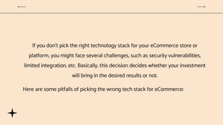 Choosing the right technology stack is crucial for eCommerce success, as a poor choice can lead to issues like limited scalability, integration challenges, and security vulnerabilities. An incompatible stack can result in slow performance and increased maintenance costs, while an outdated stack exposes the business to cyber threats. Modern solutions like the MEAN stack (MongoDB, Express.js, Angular, Node.js) may offer a more efficient and scalable approach to eCommerce technology.