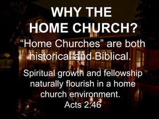 The document discusses the benefits of home churches over traditional church models. It argues that home churches allow for greater spiritual growth and fellowship as people naturally bond in a home setting. It also notes that home churches are more accessible given changing demographics as people are moving to more populated urban areas. Home churches have a low cost structure without large buildings and overhead. The document provides guidance on how to start a home church, including developing spiritual competencies, gathering a community focused on spiritual formation, and inviting others to join. The goal is to help members mature spiritually through practices like Bible study, prayer, fellowship and service.