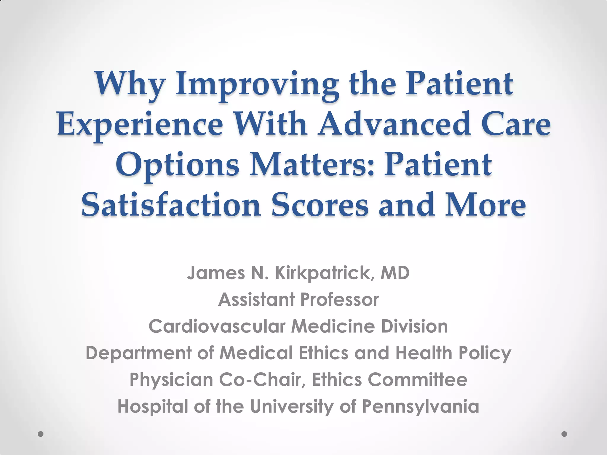This document summarizes a presentation about improving patient experience with advanced cardiac care options and how patient satisfaction scores relate to quality of care. It discusses how patient satisfaction is assessed using surveys like HCAHPS and tied to hospitals' Medicare reimbursement. While patient satisfaction often correlates with better communication, it is a complex issue and may not fully capture the quality of medical care. When discussing advanced care options, truly informed consent requires addressing patients' values, prognosis, fears and ensuring they understand their medical condition and choices.