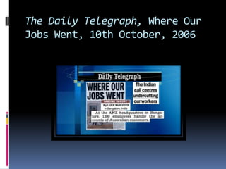 The document discusses India's growing economic and global influence. It notes that India has been growing at 9% annually and will become the third largest economy by 2050. This rapid growth has been driven by services rather than manufacturing, increasing demand for services provided by Sydney like finance, IT, education, and media. India is also consuming increasing amounts of resources and is a nuclear power. The document argues that understanding India's history, diversity, demography, poverty, and approach to globalization is important for Australia's relationship with India.