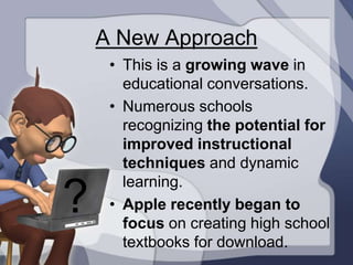 The document discusses the implementation of iPads at DLS to enhance educational experiences, highlighting their potential in facilitating dynamic learning and engagement among students. It outlines various advantages of iPads over traditional laptops, including improved interactivity, easy access to educational resources, and the ability to create and organize content effectively. Furthermore, it emphasizes the integration of multiple tools into one device, the availability of downloadable educational materials, and the incorporation of productivity and communication features.