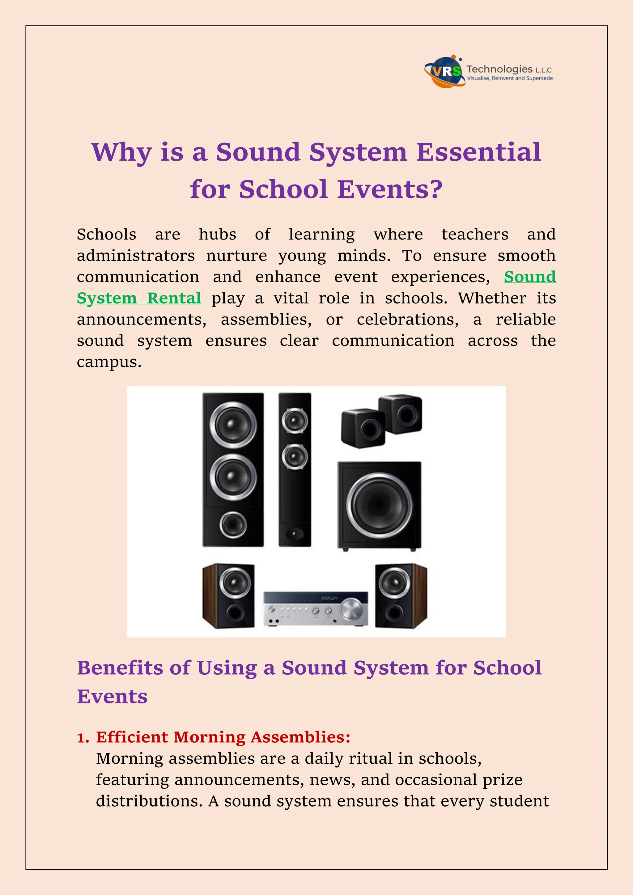Here we explained how essential is sound system for schools. School events like annual functions, and cultural fests become more engaging with a high-quality sound system. At VRS Technologies LLC, we provide reliable Sound System Rental Dubai, ensuring clear and impactful audio for every event. Call us at +971-55-5182748 to learn more.