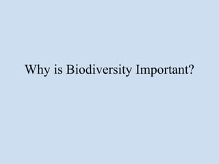 This document discusses why biodiversity is important. It begins by noting that values related to biodiversity are subjective and depend on perspective. It then outlines several categories of value provided by biodiversity, including direct use value through goods like food, medicine, and materials; indirect use value through ecosystem services like climate regulation, pollination, and nutrient cycling; and non-use values like cultural, spiritual and existence values. Several examples are provided for each category to illustrate the wide range of benefits that human societies derive from biodiversity.