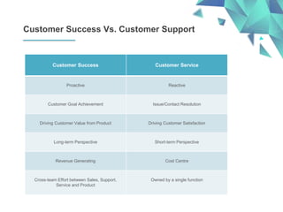 The document discusses the distinction and overlap between customer success and customer support, emphasizing a proactive approach to enhancing customer satisfaction and long-term value. It outlines methods for improving customer interactions, including effective communication, documentation, and educational resources, while stressing that all team members share responsibility for customer success metrics. The overall goal is to empower customers and streamline support processes through collaboration and resource optimization.
