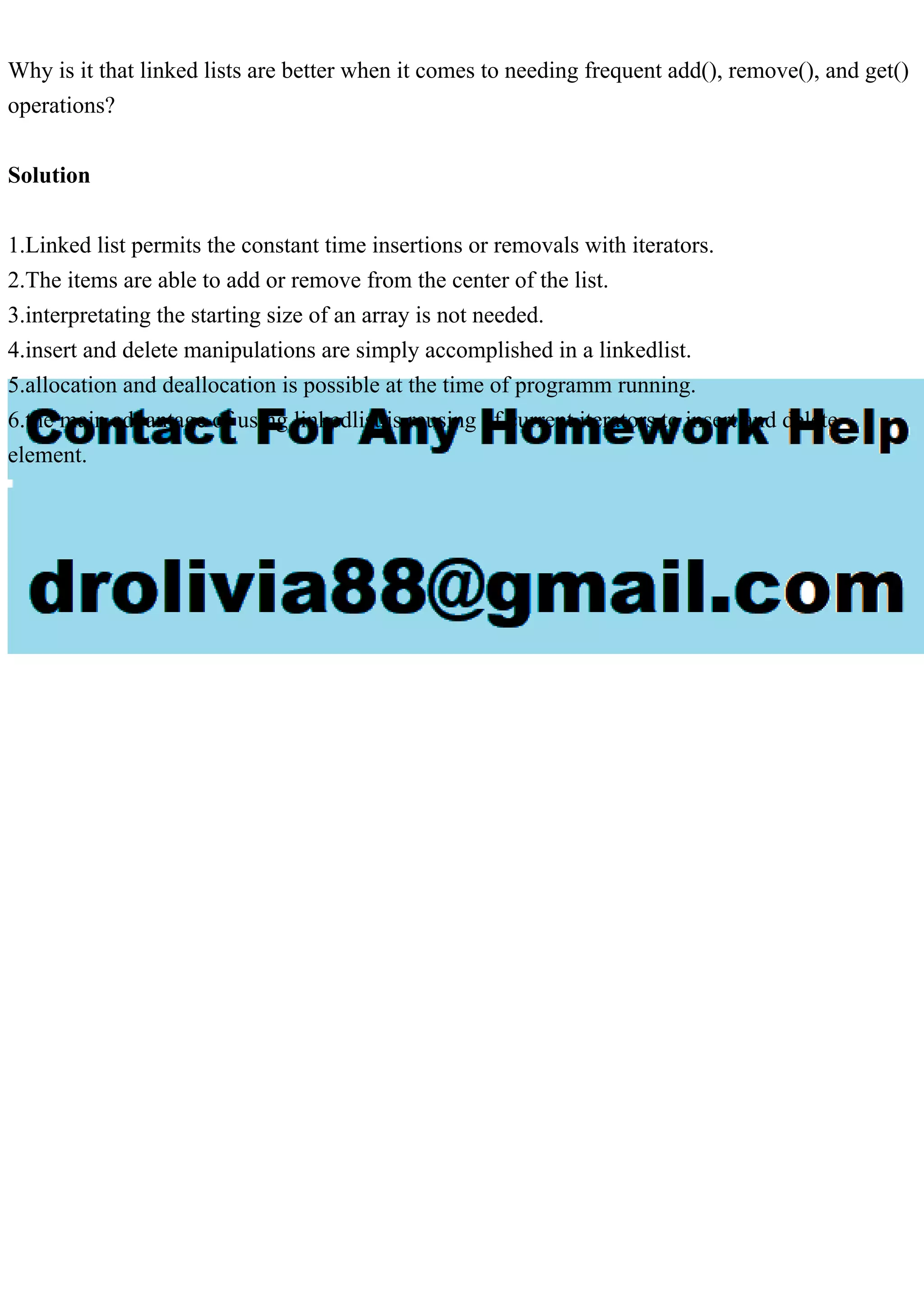 Linked lists are superior for frequent add(), remove(), and get() operations due to constant time insertions and removals with iterators. They allow modification from the center of the list without the need to define a starting size, facilitating easy allocations and deallocations during runtime. The primary benefit lies in reusing current iterators for element manipulation.