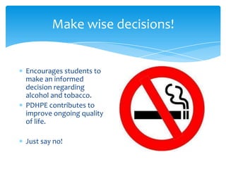 PDHPE is important as it encourages students to make wise decisions regarding substances like alcohol and tobacco, promotes healthy eating, balanced diets, and the links between nutrition, exercise and performance. It also teaches students to identify safe environments, recognize emotions from unsafe situations, and learn dance elements, skills like kicking and jumping, and fun ways to practice in teams or partnerships.