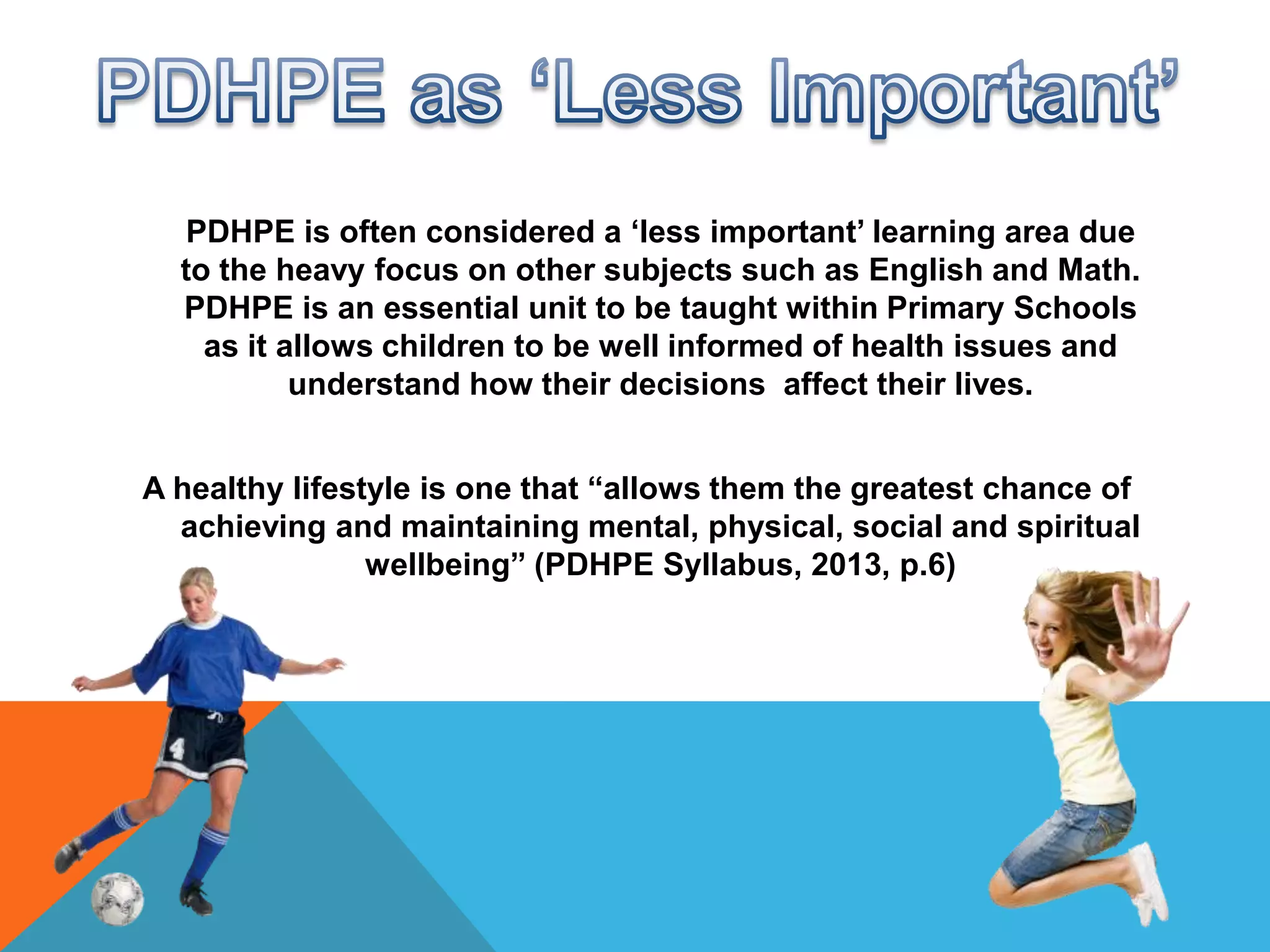 PDHPE is often considered less important than subjects like English and Math. However, the document argues that PDHPE is essential in primary schools as it educates children about health issues and how their decisions affect their lives. It promotes a healthy lifestyle that supports mental, physical, social and spiritual wellbeing. PDHPE teaches students how physical activity can improve cognitive and social skills while reducing stress, and allows them to make informed choices about factors influencing their health and wellbeing.