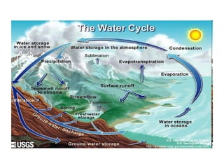 The document describes the water cycle and its importance. It explains that the sun heats water in the oceans, causing evaporation. Water evaporates from oceans, ice, snow, and plants. Rising air currents carry the vapor into the atmosphere where cooler temperatures cause condensation into clouds. Cloud particles collide and grow, then fall as precipitation in the forms of rain, snow, hail, fog or sleet. Precipitation runs off as snowmelt or surface runoff, infiltrating the ground to become groundwater or filling lakes and oceans, where the cycle repeats.