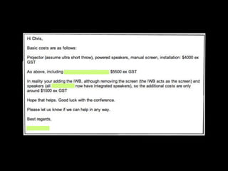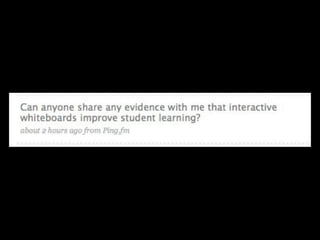 The document discusses arguments for and against the use of interactive whiteboards (IWBs) in classrooms. While IWBs can promote interactivity if used effectively, some argue they just enforce old teaching habits and teacher-centric instruction. However, others maintain that IWBs have been shown to improve teaching and learning outcomes when teachers receive proper training. The key is finding the right balance and using IWBs to enable new, engaging ways of teaching with technology rather than just projecting old methods onto the board. Whether a technology improves education depends more on how it is applied than on the technology itself.