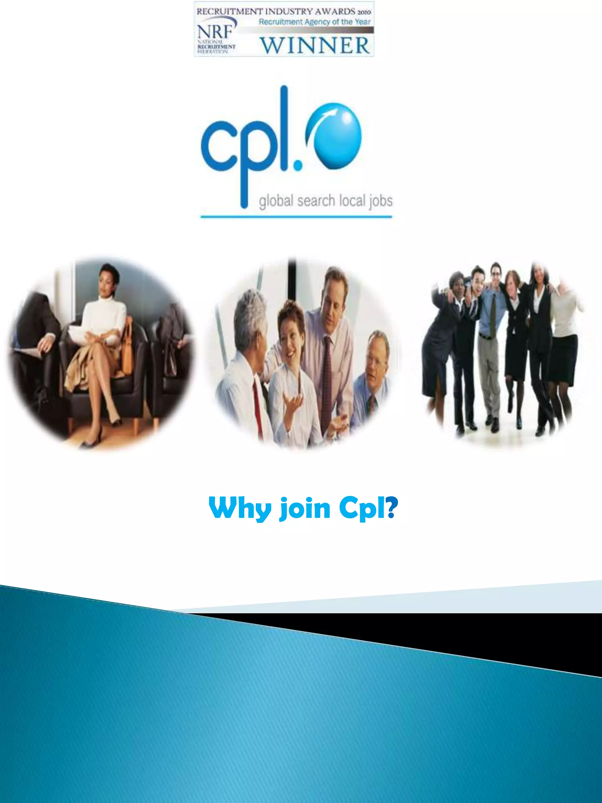 Cpl is a large recruitment agency that has seen increased demand from clients as the market turns around. It is a great time to join Cpl to be part of the growth and develop your career while being financially rewarded. Cpl has the largest client portfolio including many large multinational companies. It offers training and career development opportunities. The CEO, Anne Heraty, is an award-winning business leader who has helped make Cpl a great company to work for and develop long careers.