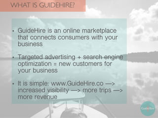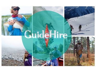 GuideHire is an online marketplace that connects consumers with outdoor businesses for activities like hiking and fishing. It offers free marketing and advertising to get businesses in front of potential customers, and takes a 10% referral fee on bookings made through the site. To get started, businesses sign up by creating a profile on the GuideHire website, which then appears in search results and allows clients to contact and book activities directly.