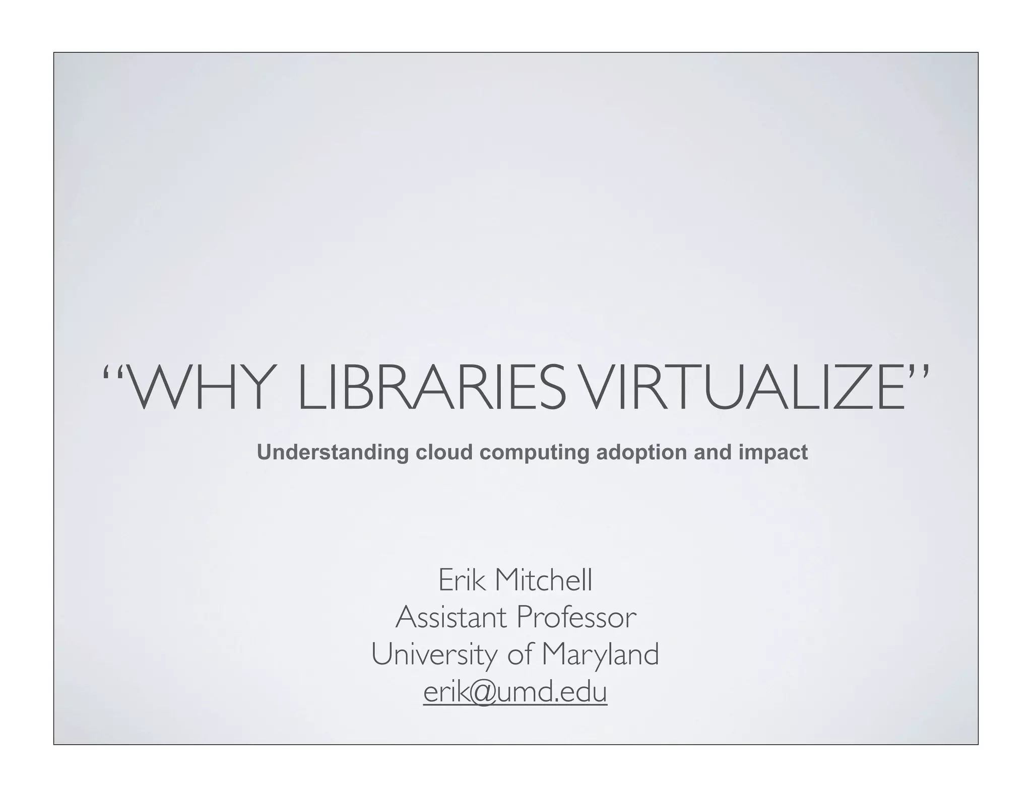 1) Libraries are increasingly adopting cloud computing to reduce costs, improve scalability and services, and focus resources on strategic priorities rather than technical infrastructure.