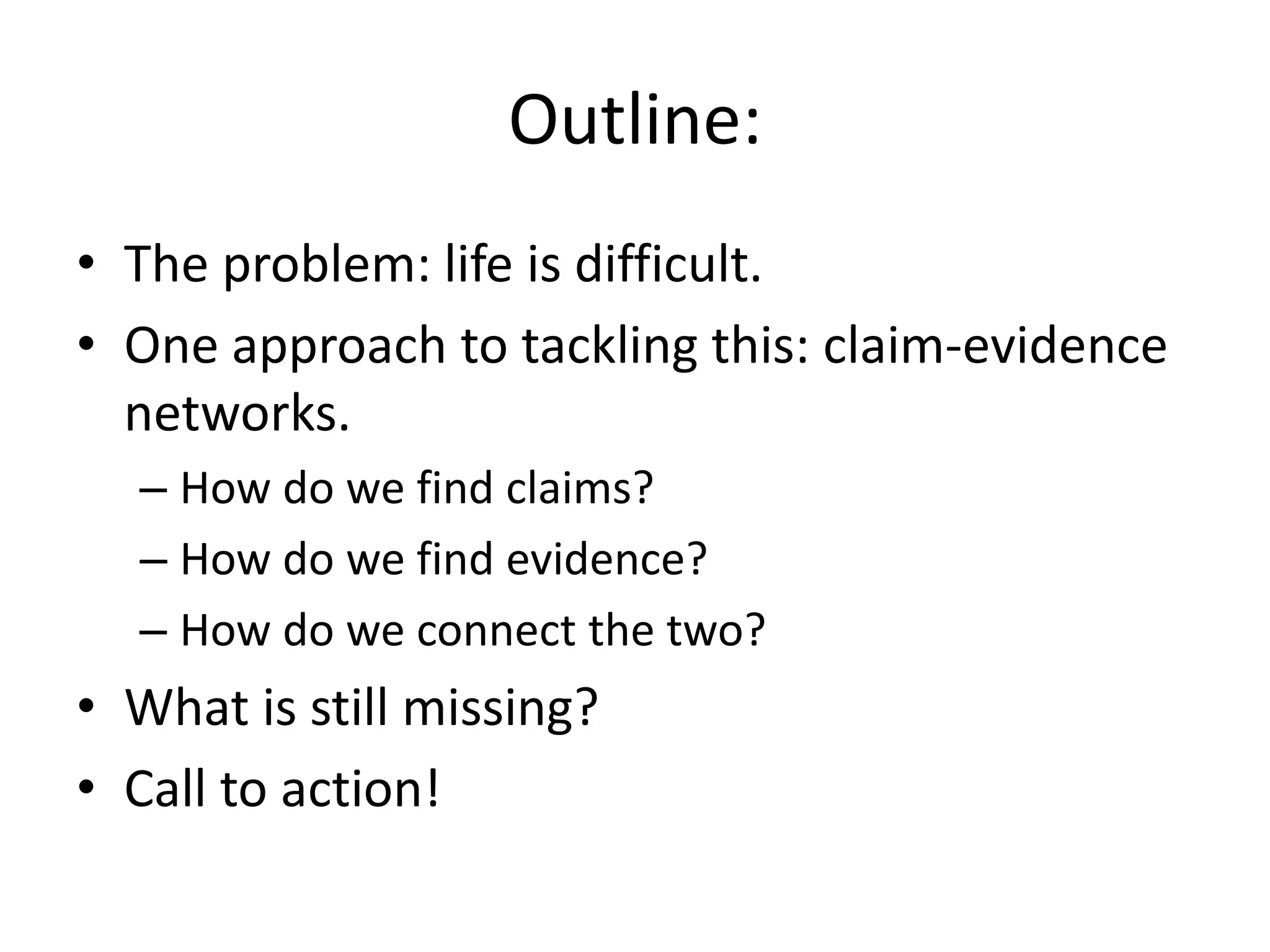 This document discusses connecting biological knowledge through claim-evidence networks. It outlines some of the challenges in biology like variability between specimens and gene expression changes. It then proposes that claim-evidence networks can be used to connect biological knowledge by linking experimental evidence to claims. Steps to build these networks include identifying claims in documents, structuring the evidence in databases, and automatically connecting the claims and evidence. Examples of efforts that link drug interactions to evidence and predict protein interactions across species are provided. However, it notes that more still needs to be done to fully realize this approach.