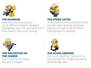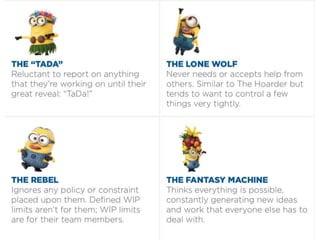 This document discusses work-in-process (WIP) limits in Kanban systems. It explains that WIP limits help improve workflow by surfacing problems. There are three types of WIP limits: personal, team execution limits to improve flow, and organizational structural limits to provide focus. Managing WIP limits can be challenging due to variability, constraints, and personal work styles, but lowering WIP limits over time helps identify issues. The document recommends several resources for learning more about Kanban and WIP limits.