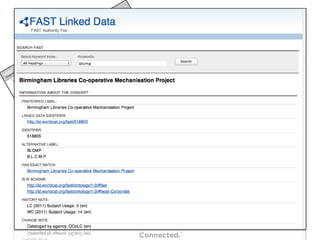 The document discusses the importance of linking libraries, archives, and museums within a cultural linked data framework to enhance access to information. It emphasizes the need for a connected data backbone for libraries using linked data technologies, facilitating better resource identification and linking. The presentation outlines various resources available and encourages libraries to shift from traditional cataloging methods to a web-oriented linking approach.