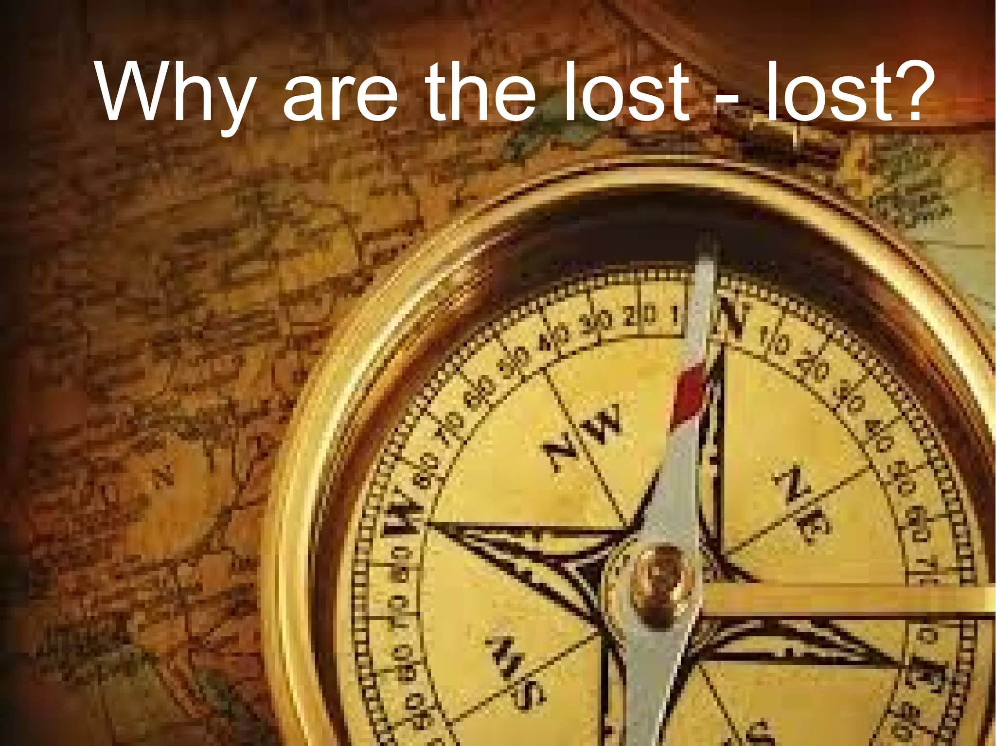 The document discusses the concept of being spiritually lost, highlighting the reasons why individuals are lost, both those who have never accepted Christ and those who are saved yet still lost due to lack of faith or rebellion. It emphasizes the importance of reaching out to the lost as part of the Great Commission. Ultimately, it offers hope and salvation through Jesus Christ as the way out of spiritual wilderness.