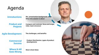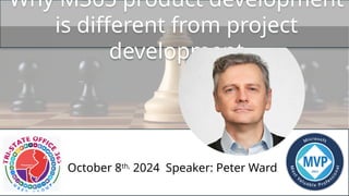 The document presents a session led by Peter Ward on the distinctions between Microsoft 365 product development and project development, focusing on their definitions, objectives, and methodologies. It emphasizes the ongoing nature of product development contrasted with the finite scope of projects, highlighting the importance of agile methodologies for adaptability and user-centric approaches. Key issues in product development include challenges such as scope creep and resource management, while benefits are noted in terms of collaboration, product quality, and flexibility.