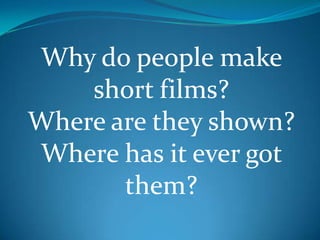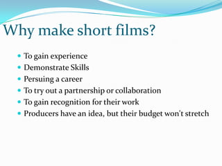 Short films are made for several reasons: to gain experience, demonstrate skills, and pursue a career in filmmaking. They are shown to friends, family, and peers; used as show reels to attract sponsors and funding; and screened at film festivals and on some television channels and in cinemas. Short films help emerging directors and producers gain recognition and build their portfolios, as evidenced by the careers of directors Spike Jonze and Joe Nussbaum, who both began with short films before finding success with feature films.