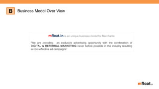 This document summarizes the business model of mfloat.in, which provides advertising opportunities for merchants through a combination of digital and referral marketing. Key aspects of the model include:
