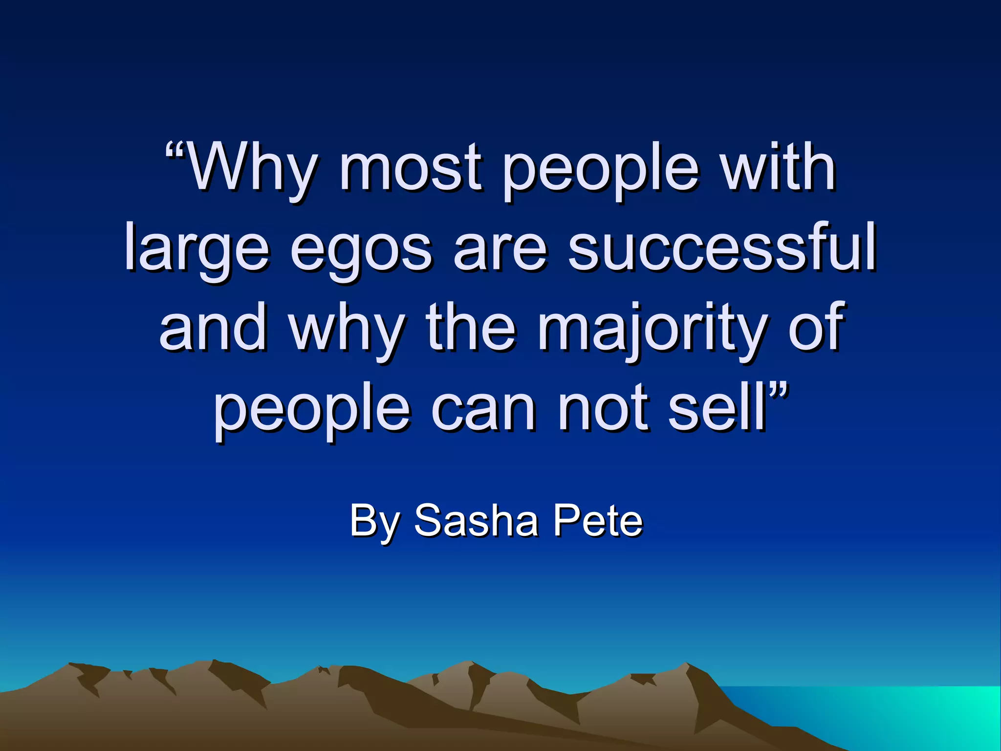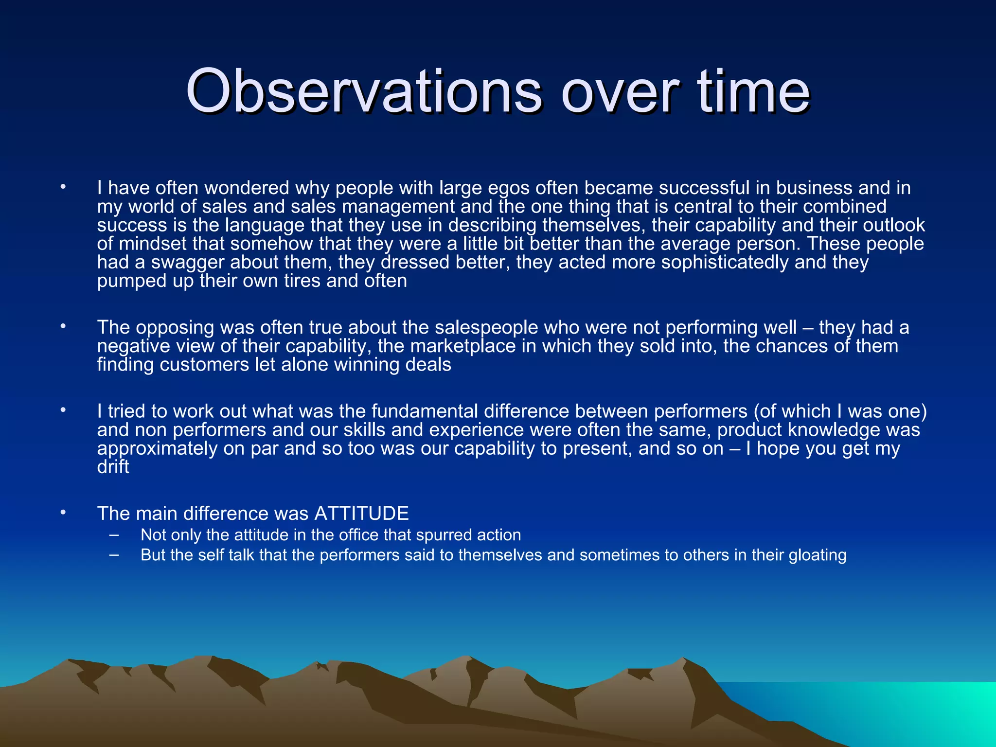 This document discusses how self-talk impacts success, particularly in sales. It observes that top sales performers generally have positive self-talk where they believe in their abilities and see opportunities, while poor performers have negative self-talk where they doubt themselves and focus on challenges. A key difference observed between a top salesperson and one who was dismissed was their mental messaging - the top performer conveyed messages of success to themselves and others, while the poor performer focused on negatives. The document suggests improving one's self-talk through positive affirmations and gratitude to impact outlook and results.