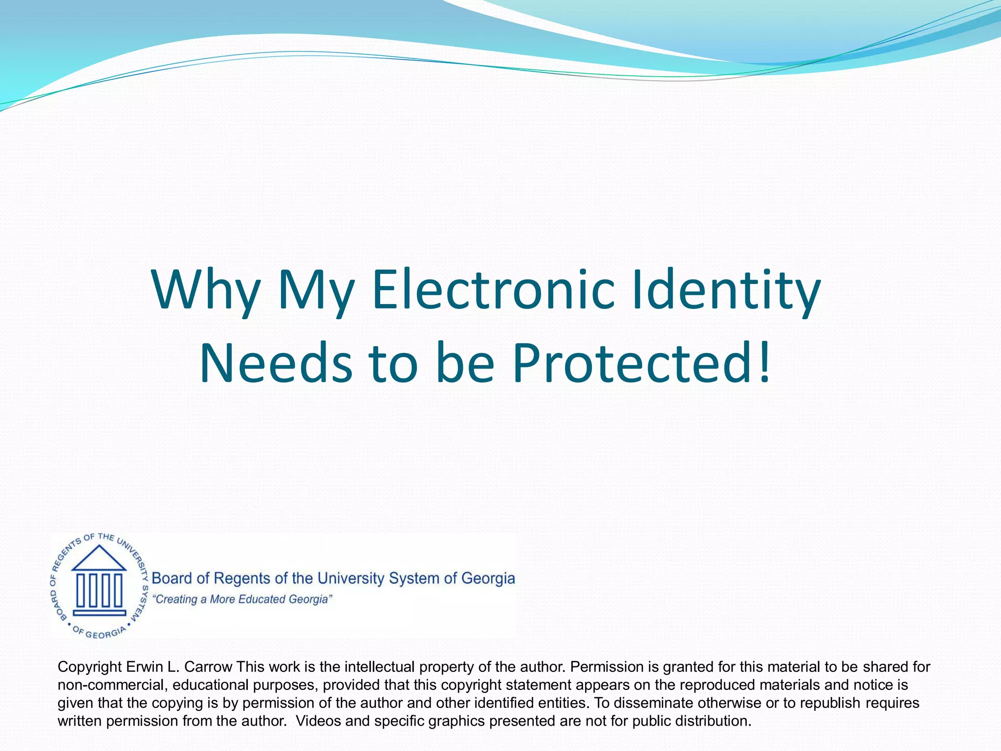 The document discusses protecting one's electronic identity and the risks of identity theft. It begins with an introduction by Erwin Carrow on his background and role conducting IT evaluations. It then outlines some key points on understanding the risk to personal information, how identities can be stolen both online and offline, and the various ways data can be lost or leaked. It provides examples of commercial and personal threats, describing how identities are exploited using social engineering and technical attacks. It notes the legal implications are still developing and that individuals bear responsibility for initiating action. Overall, the document aims to increase awareness of identity theft risks and provide resources on protecting personal information and responding to potential issues.