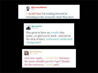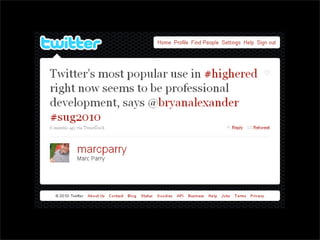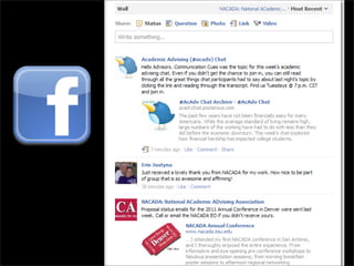 The document discusses the importance of networked advising within higher education, emphasizing the need to break down silos and foster collaboration among advisors, students, and faculty. It highlights the role of personal learning networks (PLNs) and community engagement in supporting sustainable advising practices. The author advocates for open sharing and relationship-building as essential components for effective advising.
