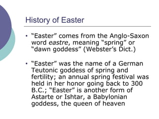The document discusses the history and origins of the term "Easter" and the holiday's observance. It notes that Easter derives from pagan goddess names and was not observed in the New Testament. While the resurrection is important, there is no biblical authorization for an annual religious festival on Easter Sunday. The document encourages Christians to worship on Sundays according to Scripture and avoid empty religious traditions not founded in the Bible.