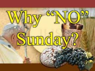 This document examines the argument of Seventh-day Adventists for observing the Sabbath on Saturday rather than Sunday. It argues that Genesis does not specifically mention the Sabbath or day names, and Jesus fulfilled the Jewish traditions and laws. The early Church decided to honor Sunday as the "Lord's Day" in remembrance of Jesus' resurrection, establishing it as the primary day of worship in Christianity rather than the Jewish Sabbath tradition of Saturday.