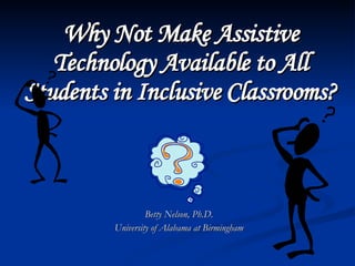 The document discusses making assistive technology available to all students in inclusive classrooms. It notes that up to 300,000 students need specialized assistive technology and that with appropriate access, 75% can remain in regular classrooms and 45% can reduce services. It provides examples of assistive technologies like audio support, alternative outputs for computers, accessible texts and library books. It emphasizes the importance of evidence-based practices and removing obstacles to collaboration between general and special educators to support all students.