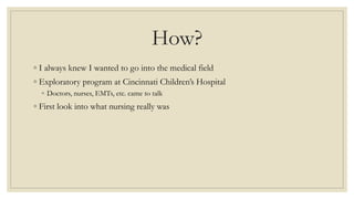 Faith Benner chose nursing because it offered more opportunities for patient contact and career flexibility compared to medical school, allowed her to treat patients holistically rather than just their disease, and enabled her to get to know patients individually and help make their days better. Her plan is to first work as a labor and delivery nurse after graduating with her BSN, and then eventually become a midwife, as she wants a career where she can work with patients, help people, and make a meaningful difference.