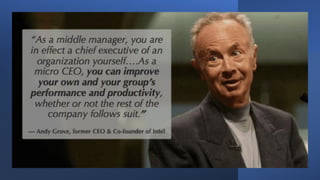The document discusses OKRs (Objectives and Key Results), a goal setting methodology used by many companies. It provides examples of how OKRs help align teams, focus efforts on priorities, and measure progress towards goals. OKRs involve setting ambitious quarterly objectives with clear and measurable key results. When implemented properly with transparency, OKRs can increase productivity by ensuring individuals understand how their work contributes to overall company objectives.