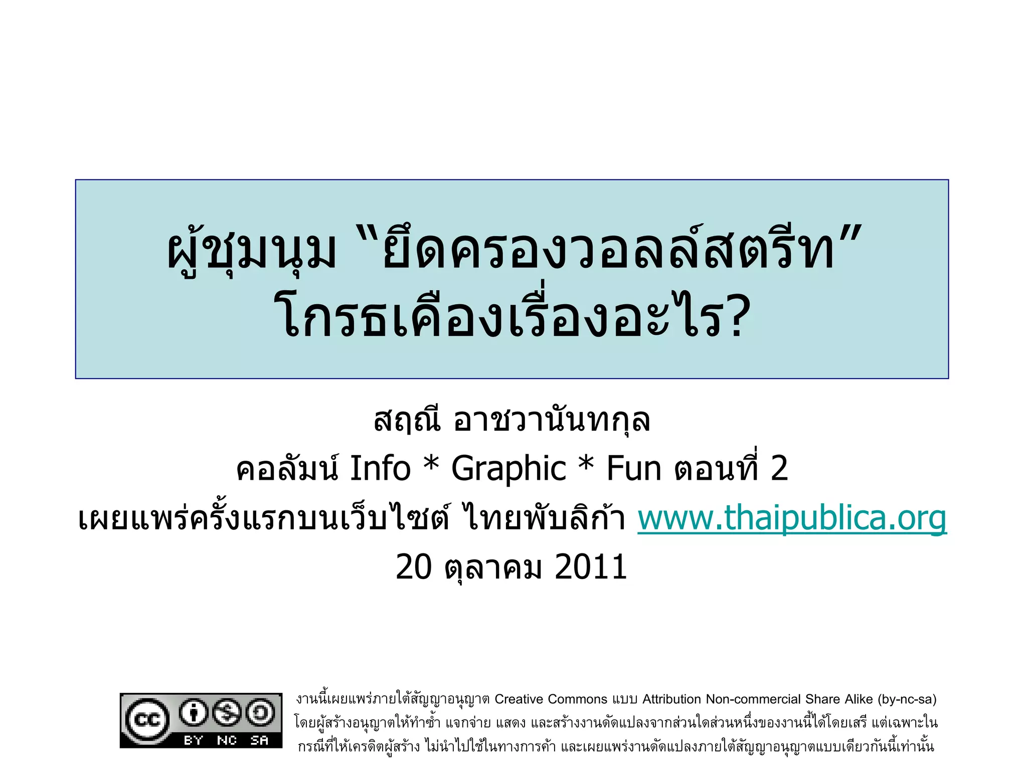 ผู้ชุมนุม "ยึดครองวอลล์สตรีท" โกรธเคืองเรื่องอะไร? แปลจาก "Here's What The Wall Street Protesters Are So Angry About" บนเว็บไซต์ BusinessInsider.com โดย สฤณี อาชวานันทกุล, 20 ตุลาคม 2011