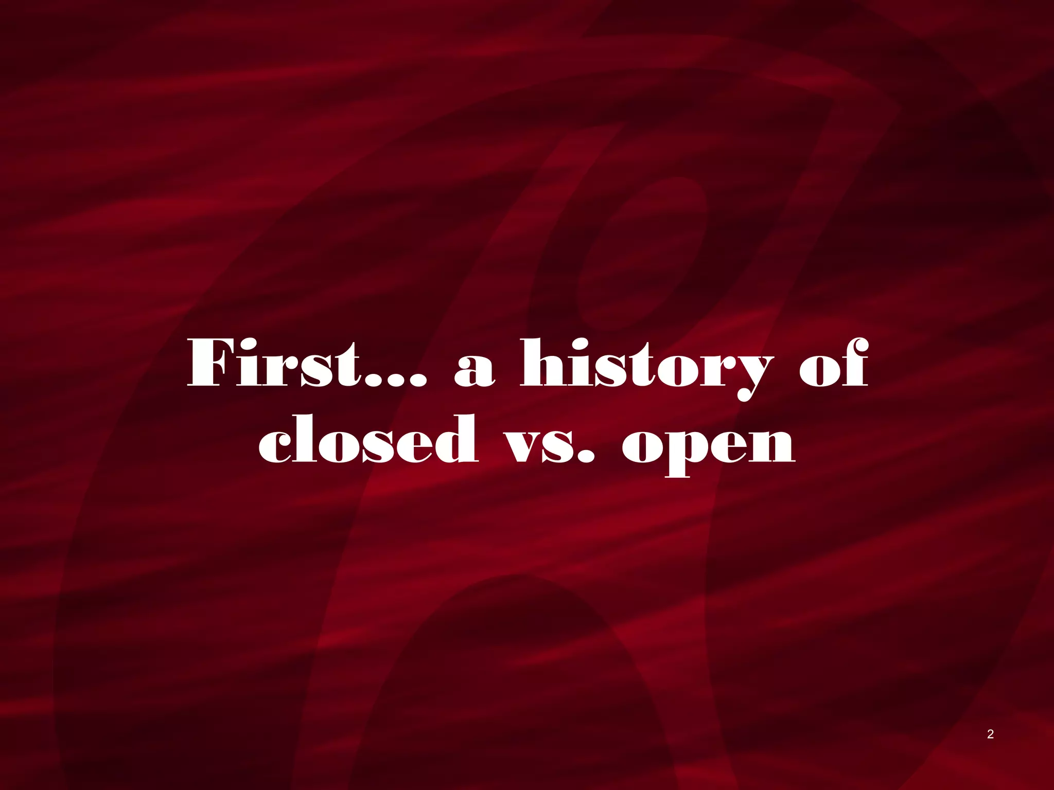 The document discusses why open cloud technologies are important. It notes that in the past, companies kept their technologies closed but that the cloud is now too large for any one company. An open cloud allows applications to have more freedom and ensures the cloud continues to grow globally for everyone's benefit. The vision is of an open cloud backed by fanatical support.