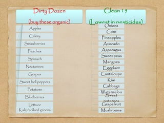 Organic farming is defined as using natural fertilizers and growing practices that encourage soil and water conservation while minimizing chemical use. Organically grown food must meet stringent standards and avoid antibiotics, artificial growth hormones, and synthetic pesticides and fertilizers. Choosing organic is better for your health as it reduces risks from pesticide residues and produces food in a way that works with nature rather than against it.